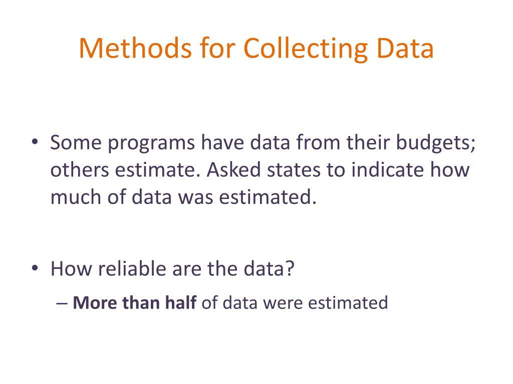 Methods for Collecting Data • Some programs have data from their budgets; others estimate. Asked states to indicate how much of data was estimated. • How reliable are the data? • More than half of data were estimated