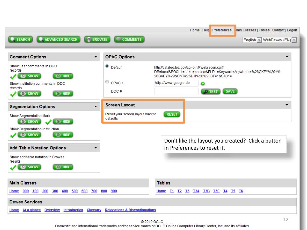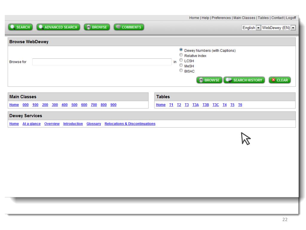 Introducing WebDewey 2.0. WebDewey 2.0 is designed with the occasional user in mind, but robust enough for an experienced user. Buttons for searching, browsing, and locating user & institution comments appear at the top of each screen, as do links to Preferences, Main classes, Tables and more.