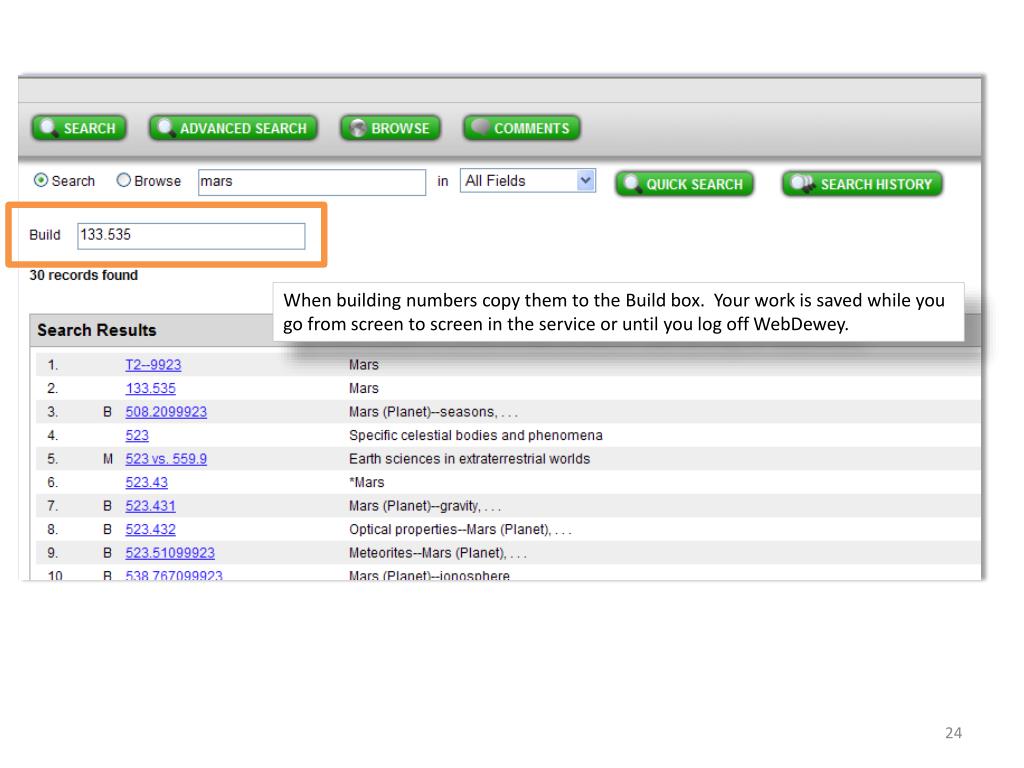 When building numbers copy them to the Build box. Your work is saved while you go from screen to screen in the service or until you log off WebDewey.