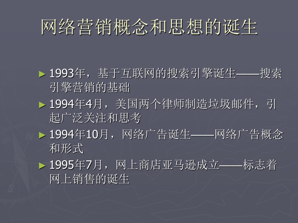 网络营销概念和思想的诞生 • 1993年,基于互联网的搜索引擎诞生——搜索引擎营销的基础 • 1994年4月,美国两个律师制造垃圾邮件,引起广泛关注和思考 • 1994年10月,网络广告诞生——网络广告概念和形式 • 1995年7月,网上商店亚马逊成立——标志着网上销售的诞生