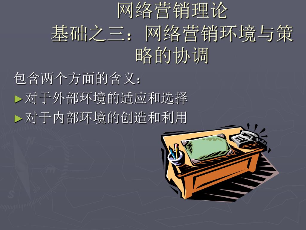 网络营销理论基础之三:网络营销环境与策略的协调网络营销理论基础之三:网络营销环境与策略的协调 包含两个方面的含义: • 对于外部环境的适应和选择 • 对于内部环境的创造和利用