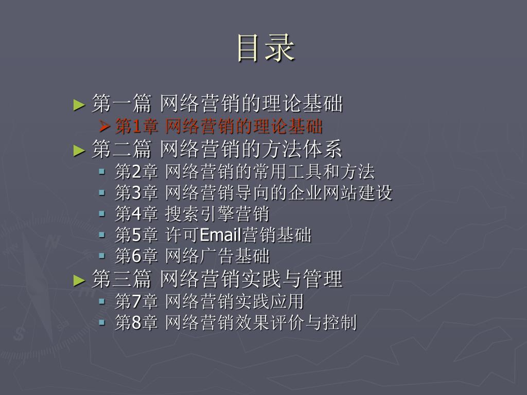 目录 • 第一篇 网络营销的理论基础 • 第1章 网络营销的理论基础 • 第二篇 网络营销的方法体系 • 第2章 网络营销的常用工具和方法 • 第3章 网络营销导向的企业网站建设 • 第4章 搜索引擎营销 • 第5章 许可Email营销基础 • 第6章 网络广告基础 • 第三篇 网络营销实践与管理 • 第7章 网络营销实践应用 • 第8章 网络营销效果评价与控制