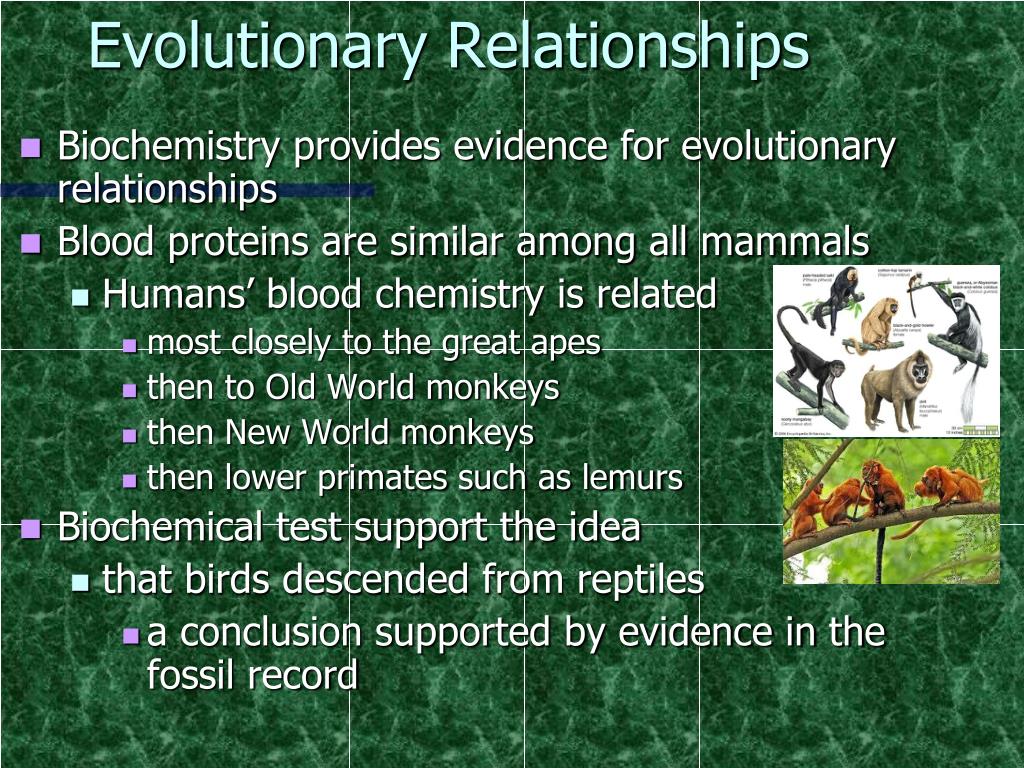 Evolutionary Relationships • Biochemistry provides evidence for evolutionary relationships • Blood proteins are similar among all mammals • Humans’ blood chemistry is related • most closely to the great apes • then to Old World monkeys • then New World monkeys • then lower primates such as lemurs • Biochemical test support the idea • that birds descended from reptiles • a conclusion supported by evidence in the fossil record
