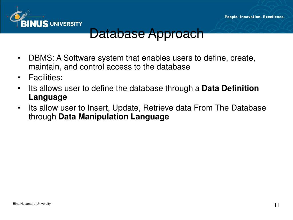 Database Approach • DBMS: A Software system that enables users to define, create, maintain, and control access to the database • Facilities: • Its allows user to define the database through a Data Definition Language • Its allow user to Insert, Update, Retrieve data From The Database through Data Manipulation Language