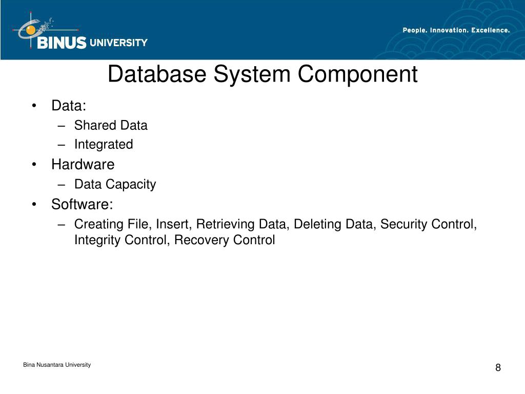 Database System Component • Data: • Shared Data • Integrated • Hardware • Data Capacity • Software: • Creating File, Insert, Retrieving Data, Deleting Data, Security Control, Integrity Control, Recovery Control