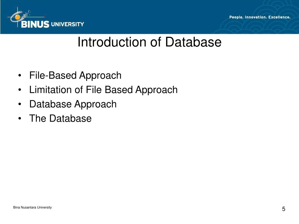 Introduction of Database • File-Based Approach • Limitation of File Based Approach • Database Approach • The Database