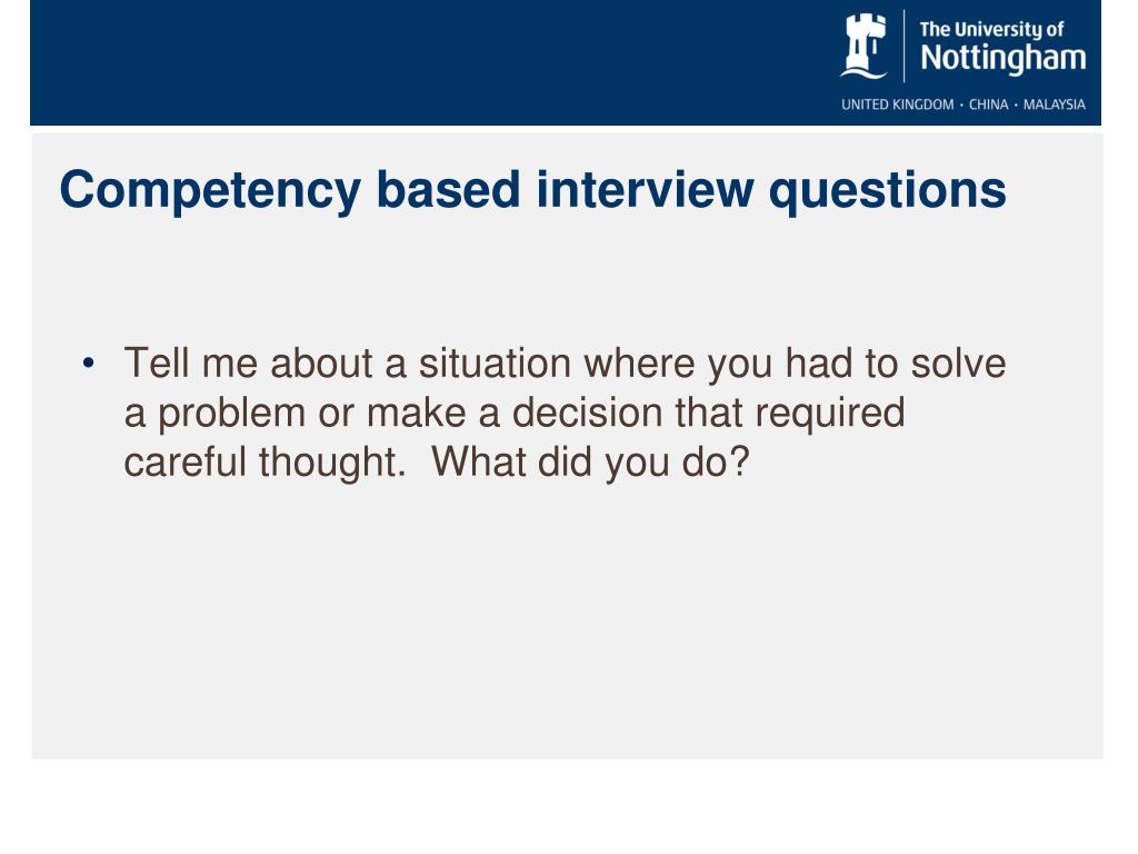 Competency based interview questions • Tell me about a situation where you had to solve a problem or make a decision that required careful thought. What did you do?