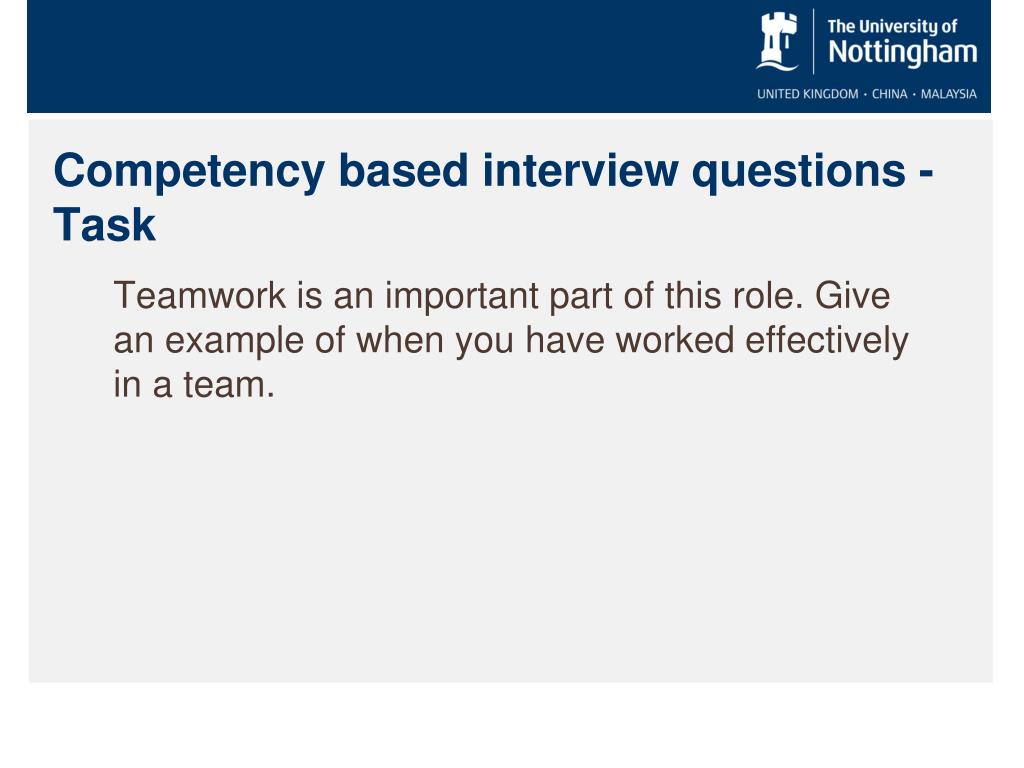 Competency based interview questions - Task Teamwork is an important part of this role. Give an example of when you have worked effectively in a team.