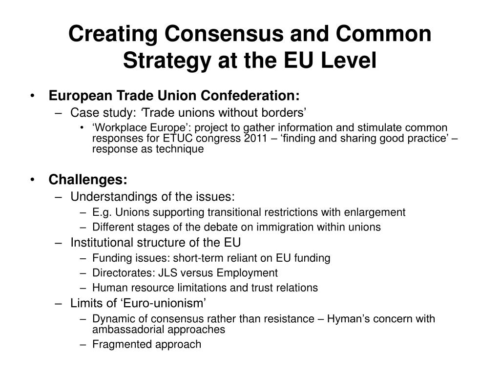 Creating Consensus and Common Strategy at the EU Level • European Trade Union Confederation: • Case study: ‘Trade unions without borders’ • ‘Workplace Europe’: project to gather information and stimulate common responses for ETUC congress 2011 – ‘finding and sharing good practice’ – response as technique • Challenges: • Understandings of the issues: • E.g. Unions supporting transitional restrictions with enlargement • Different stages of the debate on immigration within unions • Institutional structure of the EU • Funding issues: short-term reliant on EU funding • Directorates: JLS versus Employment • Human resource limitations and trust relations • Limits of ‘Euro-unionism’ • Dynamic of consensus rather than resistance – Hyman’s concern with ambassadorial approaches • Fragmented approach