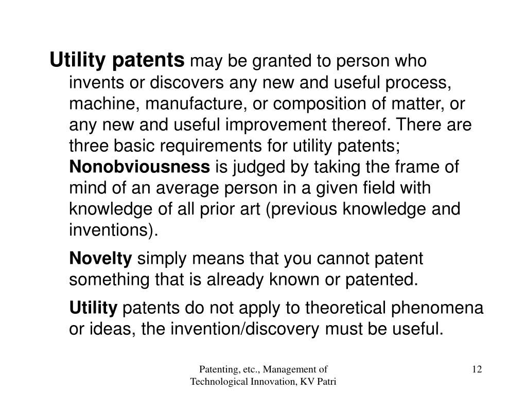 Utility patents may be granted to person who invents or discovers any new and useful process, machine, manufacture, or composition of matter, or any new and useful improvement thereof. There are three basic requirements for utility patents; Nonobviousness is judged by taking the frame of mind of an average person in a given field with knowledge of all prior art (previous knowledge and inventions). Novelty simply means that you cannot patent something that is already known or patented. Utility patents do not apply to theoretical phenomena or ideas, the invention/discovery must be useful. Patenting, etc., Management of Technological Innovation, KV Patri