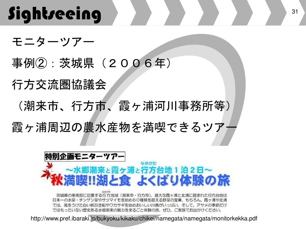 Sightseeing モニターツアー 事例②:茨城県(2006年) 行方交流圏協議会 (潮来市、行方市、霞ヶ浦河川事務所等) 霞ヶ浦周辺の農水産物を満喫できるツアー http://www.pref.ibaraki.jp/bukyoku/kikaku/chikei/namegata/namegata/monitorkekka.pdf