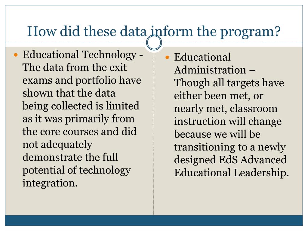 How did these data inform the program? Educational Technology - The data from the exit exams and portfolio have shown that the data being collected is limited as it was primarily from the core courses and did not adequately demonstrate the full potential of technology integration. Educational Administration – Though all targets have either been met, or nearly met, classroom instruction will change because we will be transitioning to a newly designed EdS Advanced Educational Leadership.