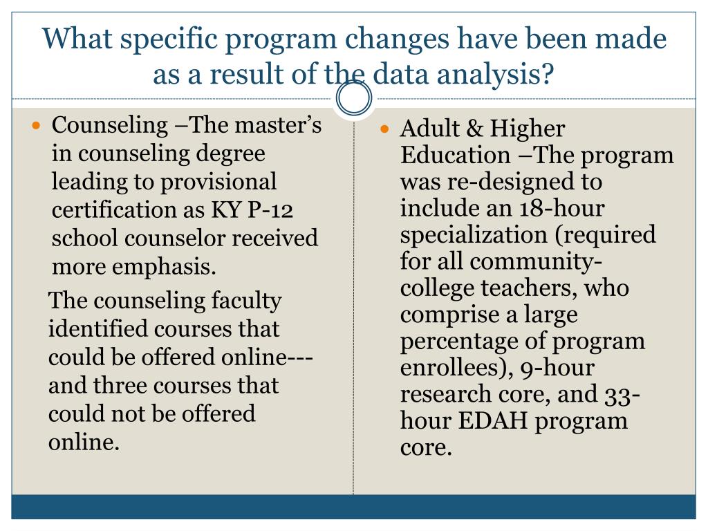 What specific program changes have been made as a result of the data analysis? Counseling –The master’s in counseling degree leading to provisional certification as KY P-12 school counselor received more emphasis. The counseling faculty identified courses that could be offered online---and three courses that could not be offered online. Adult & Higher Education –The program was re-designed to include an 18-hour specialization (required for all community-college teachers, who comprise a large percentage of program enrollees), 9-hour research core, and 33-hour EDAH program core.