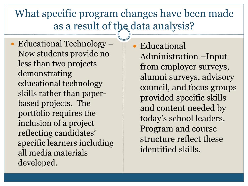 What specific program changes have been made as a result of the data analysis? Educational Technology –Now students provide no less than two projects demonstrating educational technology skills rather than paper-based projects. The portfolio requires the inclusion of a project reflecting candidates’ specific learners including all media materials developed. Educational Administration –Input from employer surveys, alumni surveys, advisory council, and focus groups provided specific skills and content needed by today’s school leaders. Program and course structure reflect these identified skills.