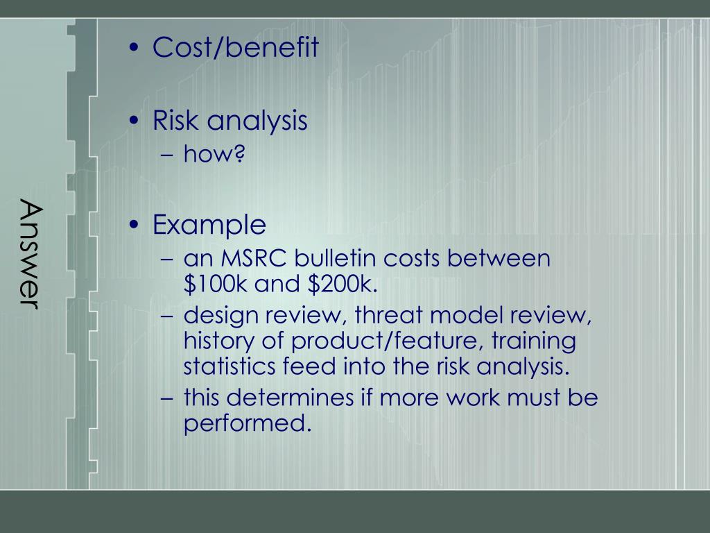 Answer • Cost/benefit • Risk analysis • how? • Example • an MSRC bulletin costs between $100k and $200k. • design review, threat model review, history of product/feature, training statistics feed into the risk analysis. • this determines if more work must be performed.