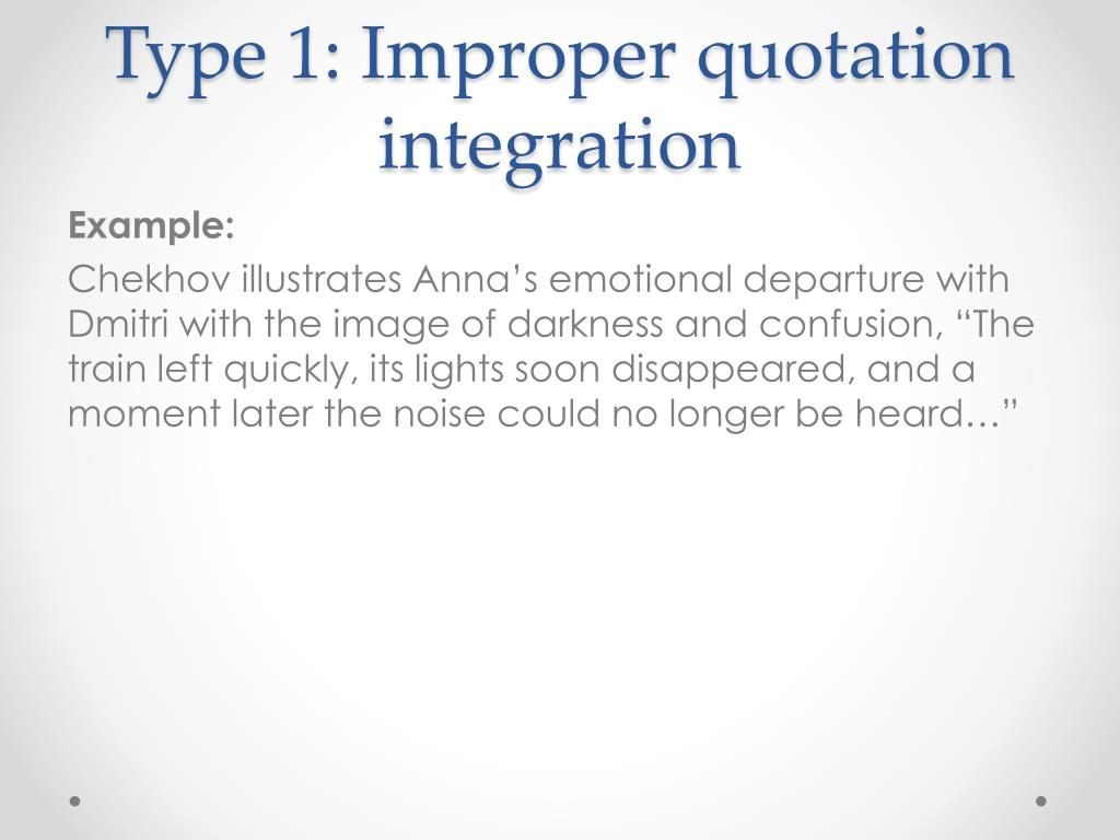 Type 1: Improper quotation integration Example: Chekhov illustrates Anna’s emotional departure with Dmitri with the image of darkness and confusion, “The train left quickly, its lights soon disappeared, and a moment later the noise could no longer be heard…”