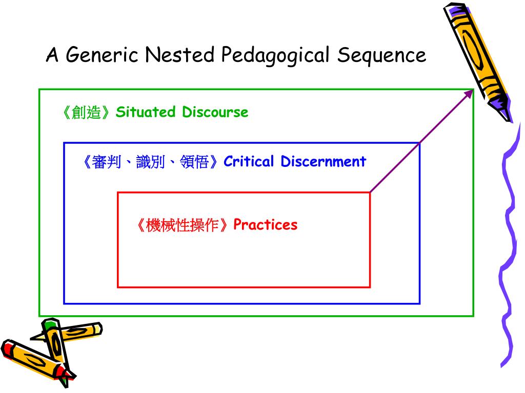 A Generic Nested Pedagogical Sequence 《創造》Situated Discourse 《審判、識別、領悟》Critical Discernment 《機械性操作》Practices