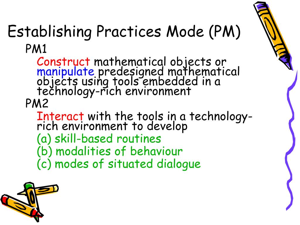 Establishing Practices Mode (PM) PM1 Construct mathematical objects or manipulate predesigned mathematical objects using tools embedded in a technology-rich environment PM2 Interact with the tools in a technology-rich environment to develop (a) skill-based routines (b) modalities of behaviour (c) modes of situated dialogue
