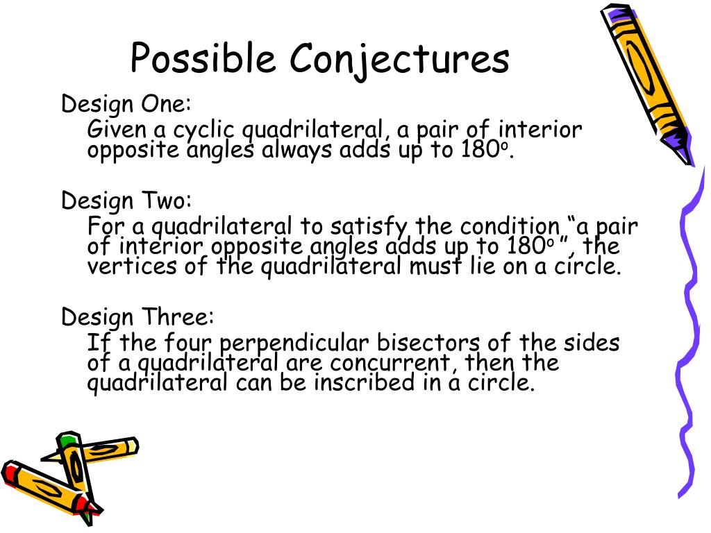 Possible Conjectures Design One: Given a cyclic quadrilateral, a pair of interior opposite angles always adds up to 180o. Design Two: For a quadrilateral to satisfy the condition “a pair of interior opposite angles adds up to 180o ”, the vertices of the quadrilateral must lie on a circle. Design Three: If the four perpendicular bisectors of the sides of a quadrilateral are concurrent, then the quadrilateral can be inscribed in a circle.