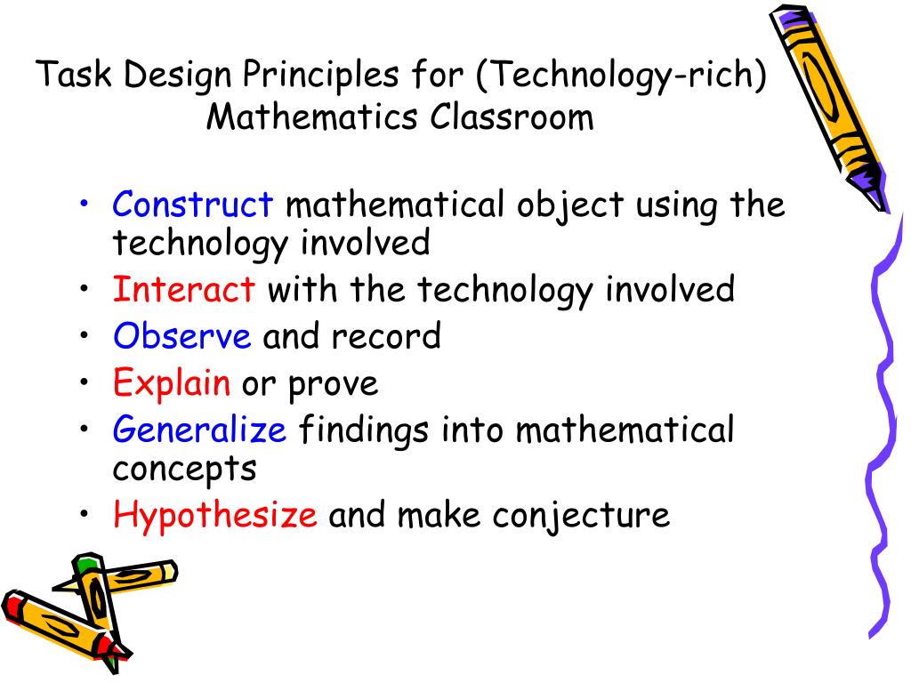 Task Design Principles for (Technology-rich)Mathematics Classroom • Construct mathematical object using the technology involved • Interact with the technology involved • Observe and record • Explain or prove • Generalize findings into mathematical concepts • Hypothesize and make conjecture