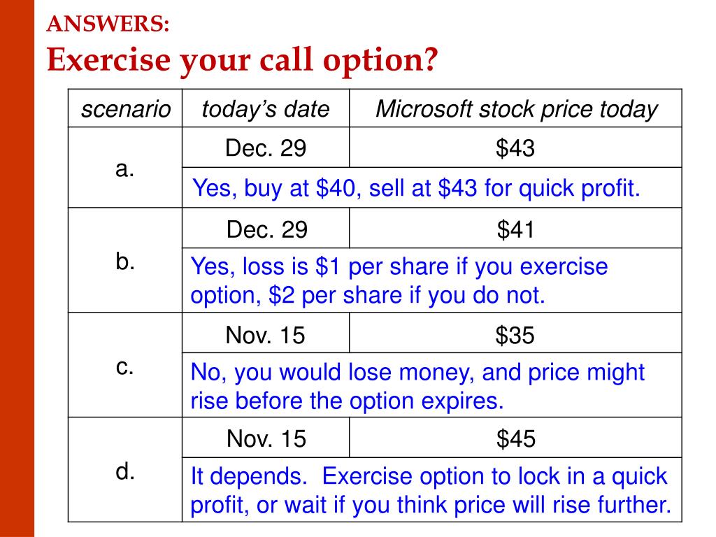 ANSWERS:Exercise your call option? • Yes, buy at $40, sell at $43 for quick profit. • b. • Yes, loss is $1 per share if you exercise option, $2 per share if you do not. • c. • No, you would lose money, and price might rise before the option expires. • d. • It depends. Exercise option to lock in a quick profit, or wait if you think price will rise further.