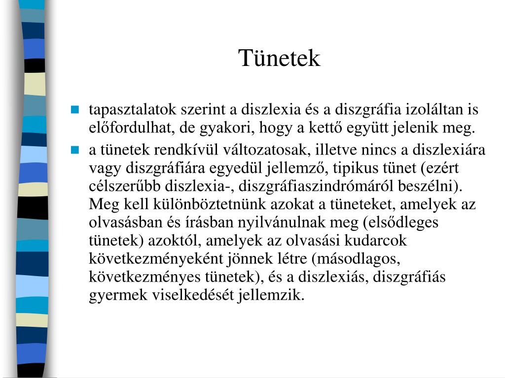 Tünetek • általános teljesítménycsökkenés: lassú olvasási, írási tempó és tartós hibázás, gyakori újrakezdés • a hibázás módja, típusa szerint: ezeket jelentősen gyakrabban követik el, mint az átlagosan vagy jól olvasók, s betűkre, szótagokra, szavakra is vonatkoz(hat)nak
