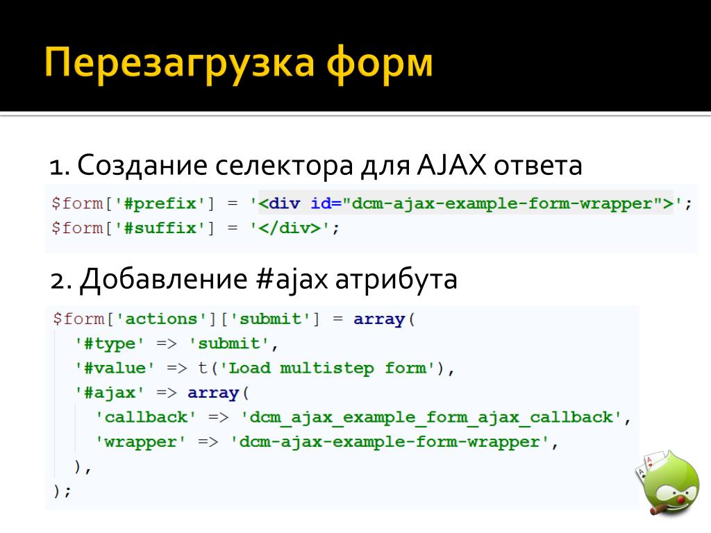 Перезагрузка форм 1. Создание селектора для AJAX ответа 2. Добавление #ajax атрибута