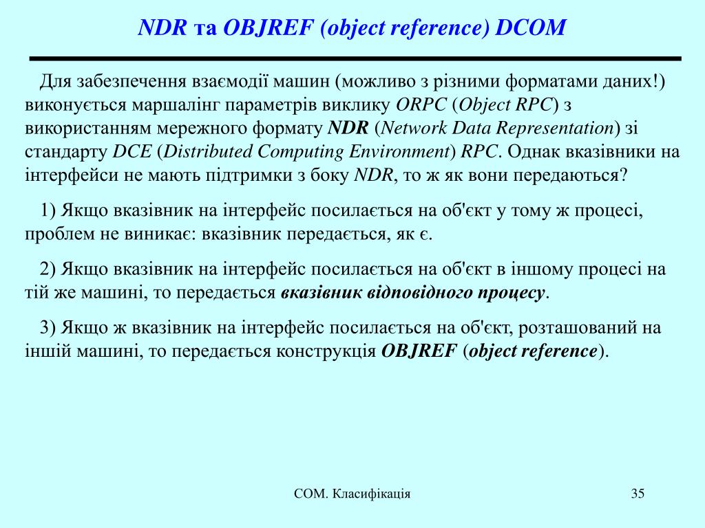 NDR та OBJREF (object reference) DCOM Для забезпечення взаємодії машин (можливо з різними форматами даних!) виконується маршалінг параметрів виклику ORPC (Object RPC) з використанням мережного формату NDR (Network Data Representation) зі стандарту DCE (Distributed Computing Environment) RPC. Однак вказівники на інтерфейси не мають підтримки з боку NDR, то ж як вони передаються? 1) Якщо вказівник на інтерфейс посилається на об'єкт у тому ж процесі, проблем не виникає: вказівник передається, як є. 2) Якщо вказівник на інтерфейс посилається на об'єкт в іншому процесі на тій же машині, то передається вказівник відповідного процесу. 3) Якщо ж вказівник на інтерфейс посилається на об'єкт, розташований на іншій машині, то передається конструкція OBJREF (object reference). COM. Класифікація