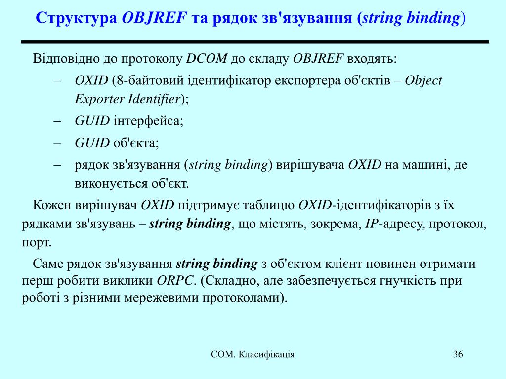 Структура OBJREF та рядок зв'язування (string binding) Відповідно до протоколу DCOM до складу OBJREF входять: • OXID (8-байтовий ідентифікатор експортера об'єктів – Object Exporter Identifier); • GUID інтерфейса; • GUID об'єкта; • рядок зв'язування (string binding) вирішувача OXID на машині, де виконується об'єкт. Кожен вирішувач OXID підтримує таблицю OXID-ідентифікаторів з їх рядками зв'язувань – string binding, що містять, зокрема, IP-адресу, протокол, порт. Саме рядок зв'язування string binding з об'єктом клієнт повинен отримати перш робити виклики ORPC. (Складно, але забезпечується гнучкість при роботі з різними мережевими протоколами). COM. Класифікація
