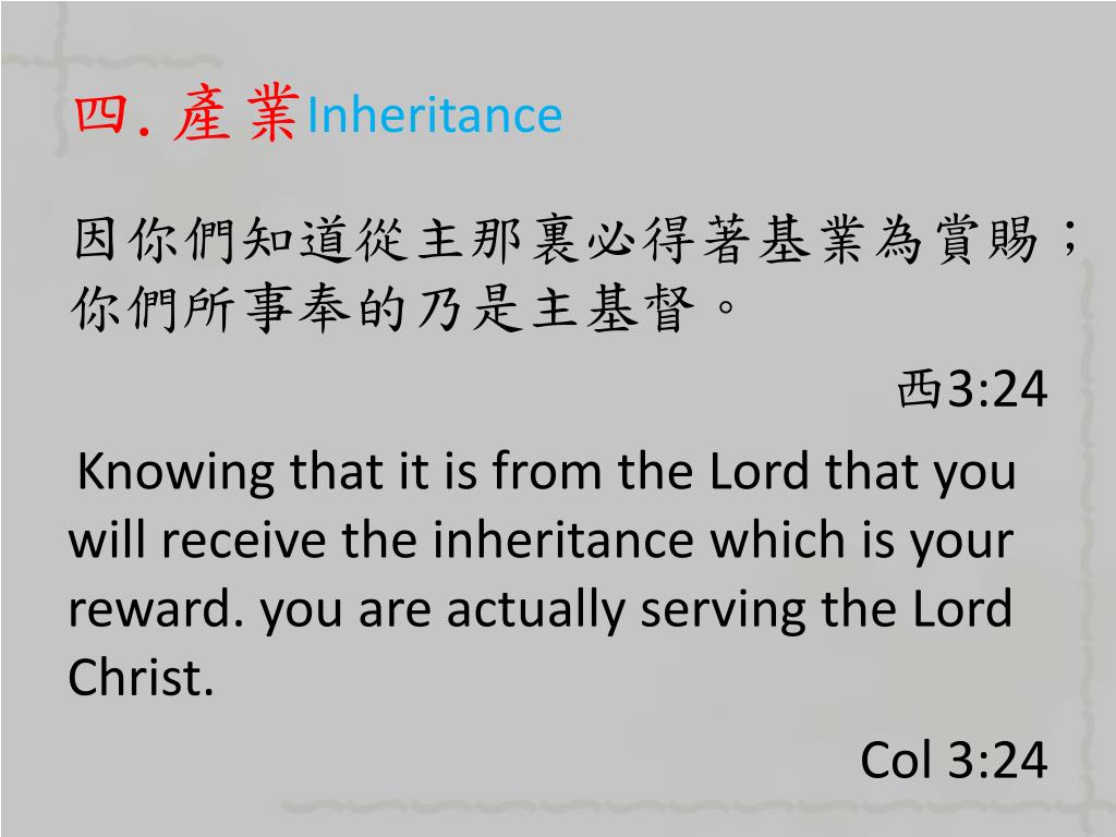四.產業Inheritance 因你們知道從主那裏必得著基業為賞賜;你們所事奉的乃是主基督。 西3:24 Knowing that it is from the Lord that you will receive the inheritance which is your reward. you are actually serving the Lord Christ. Col 3:24