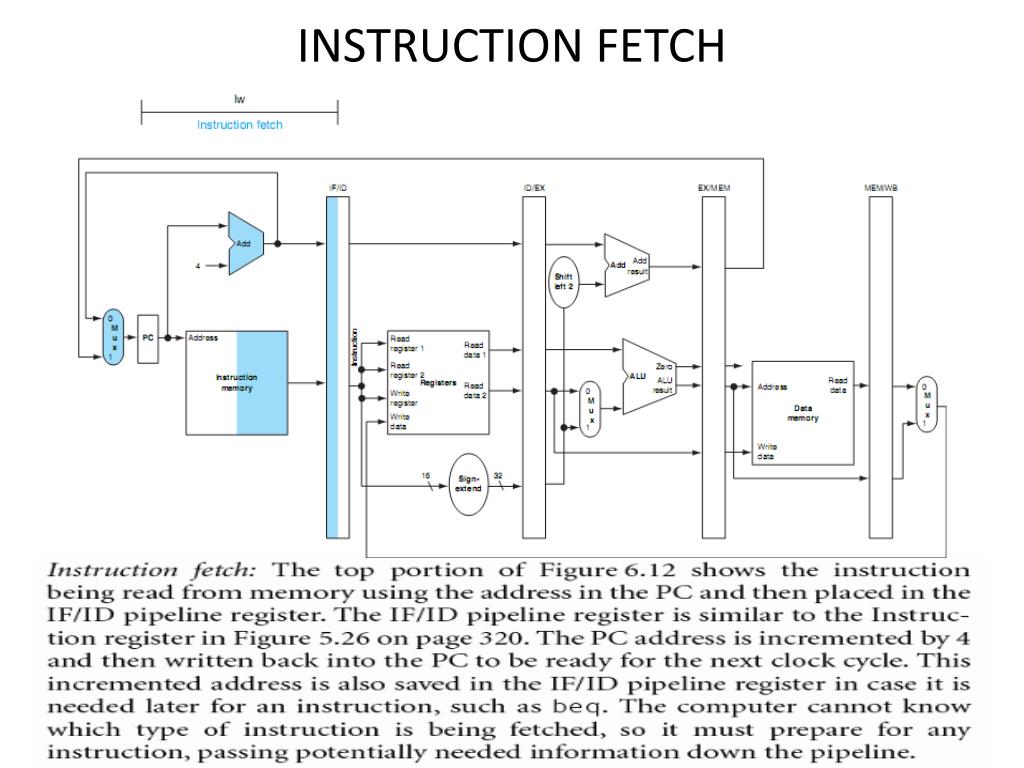 LW instruction for pipelined Datapath • To maintain proper time order, this stylized datapath breaks the register file into two logical parts: registers read during register fetch (ID) and registers written during write back (WB). This dual use is represented by drawing the unshaded left half of the register fi le using dashed lines in the ID stage, when it is not being written, and the unshaded right half in dashed lines in the WB stage, when it is not being read. As before, we assume the register fi le is written in the first half of the clock cycle and the register fi le is read during the second half.