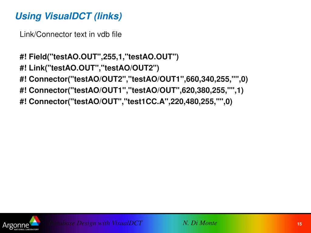 Using VisualDCT (links) Link/Connector text in vdb file #! Field("testAO.OUT",255,1,"testAO.OUT") #! Link("testAO.OUT","testAO/OUT2") #! Connector("testAO/OUT2","testAO/OUT1",660,340,255,"",0) #! Connector("testAO/OUT1","testAO/OUT",620,380,255,"",1) #! Connector("testAO/OUT","test1CC.A",220,480,255,"",0)