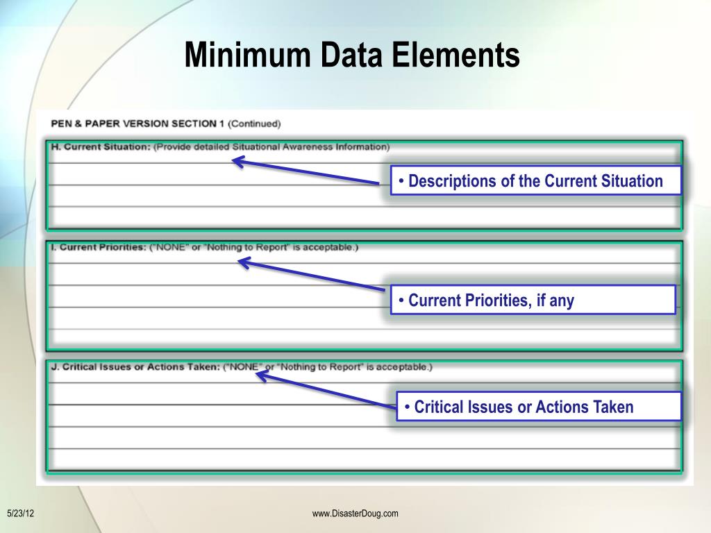 Minimum Data Elements • Descriptions of the Current Situation • Current Priorities, if any • Critical Issues or Actions Taken www.DisasterDoug.com