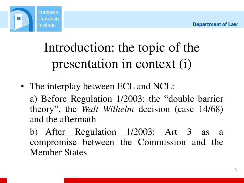 Introduction: the topic of the presentation in context (i) • The interplay between ECL and NCL: a) Before Regulation 1/2003: the “double barrier theory”, the Walt Wilhelm decision (case 14/68) and the aftermath b) After Regulation 1/2003: Art 3 as a compromise between the Commission and the Member States