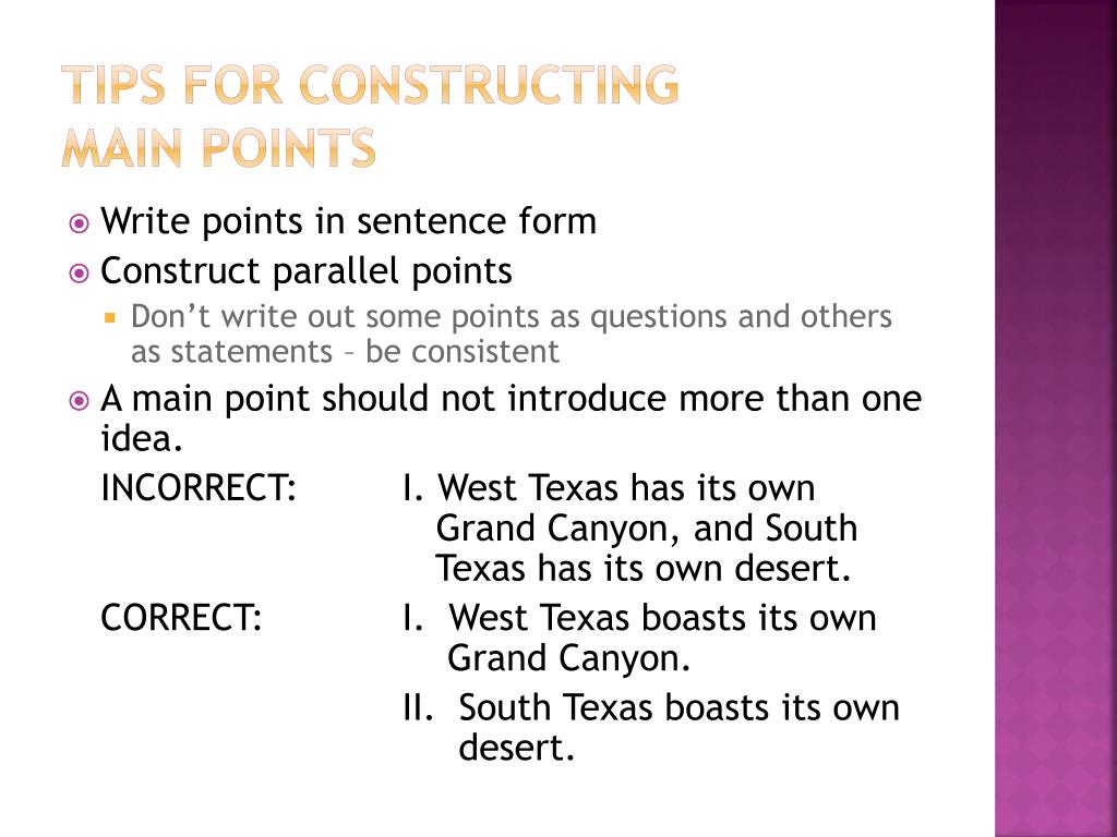 Tips for constructing main points • Write points in sentence form • Construct parallel points • Don’t write out some points as questions and others as statements – be consistent • A main point should not introduce more than one idea. INCORRECT: I. West Texas has its own Grand Canyon, and South Texas has its own desert. CORRECT: I. West Texas boasts its own Grand Canyon. II. South Texas boasts its own desert.