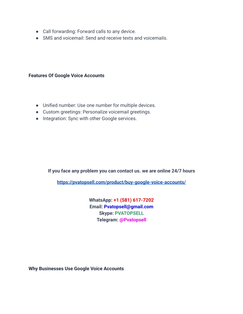 ● Call forwarding: Forward calls to any device. ● SMS and voicemail: Send and receive texts and voicemails. Features Of Google Voice Accounts ● Unified number: Use one number for multiple devices. ● Custom greetings: Personalize voicemail greetings. ● Integration: Sync with other Google services. If you face any problem you can contact us. we are online 24/7 hours https://pvatopsell.com/product/buy-google-voice-accounts/ WhatsApp: +1 (581) 617-7202 Email: Pvatopsell@gmail.com Skype: PVATOPSELL Telegram: @Pvatopsell Why Businesses Use Google Voice Accounts