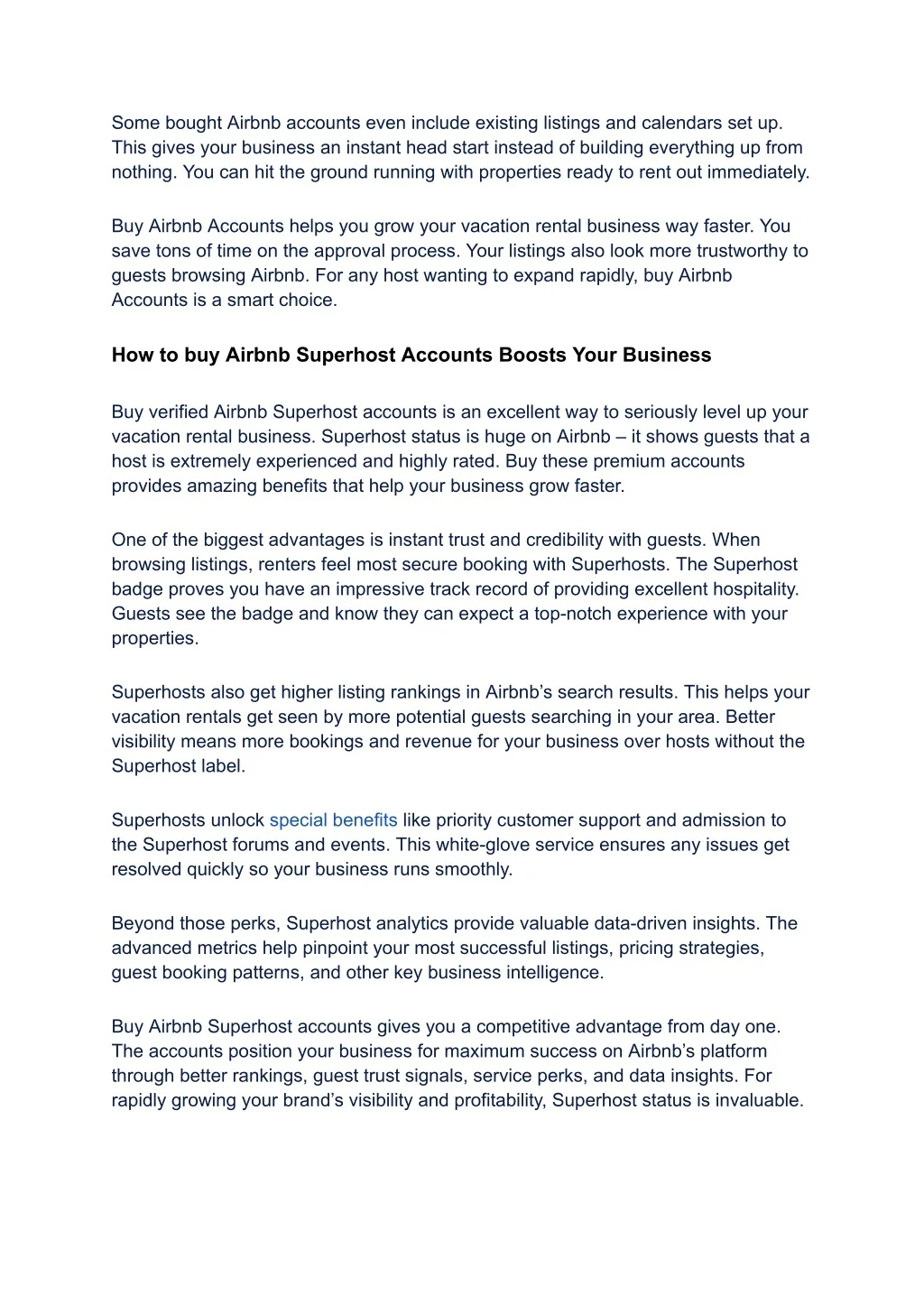 Some bought Airbnb accounts even include existing listings and calendars set up. This gives your business an instant head start instead of building everything up from nothing. You can hit the ground running with properties ready to rent out immediately. Buy Airbnb Accounts helps you grow your vacation rental business way faster. You save tons of time on the approval process. Your listings also look more trustworthy to guests browsing Airbnb. For any host wanting to expand rapidly, buy Airbnb Accounts is a smart choice. How to buy Airbnb Superhost Accounts Boosts Your Business Buy verified Airbnb Superhost accounts is an excellent way to seriously level up your vacation rental business. Superhost status is huge on Airbnb – it shows guests that a host is extremely experienced and highly rated. Buy these premium accounts provides amazing benefits that help your business grow faster. One of the biggest advantages is instant trust and credibility with guests. When browsing listings, renters feel most secure booking with Superhosts. The Superhost badge proves you have an impressive track record of providing excellent hospitality. Guests see the badge and know they can expect a top-notch experience with your properties. Superhosts also get higher listing rankings in Airbnb’s search results. This helps your vacation rentals get seen by more potential guests searching in your area. Better visibility means more bookings and revenue for your business over hosts without the Superhost label. Superhosts unlock special benefits like priority customer support and admission to the Superhost forums and events. This white-glove service ensures any issues get resolved quickly so your business runs smoothly. Beyond those perks, Superhost analytics provide valuable data-driven insights. The advanced metrics help pinpoint your most successful listings, pricing strategies, guest booking patterns, and other key business intelligence. Buy Airbnb Superhost accounts gives you a competitive advantage from day one. The accounts position your business for maximum success on Airbnb’s platform through better rankings, guest trust signals, service perks, and data insights. For rapidly growing your brand’s visibility and profitability, Superhost status is invaluable.