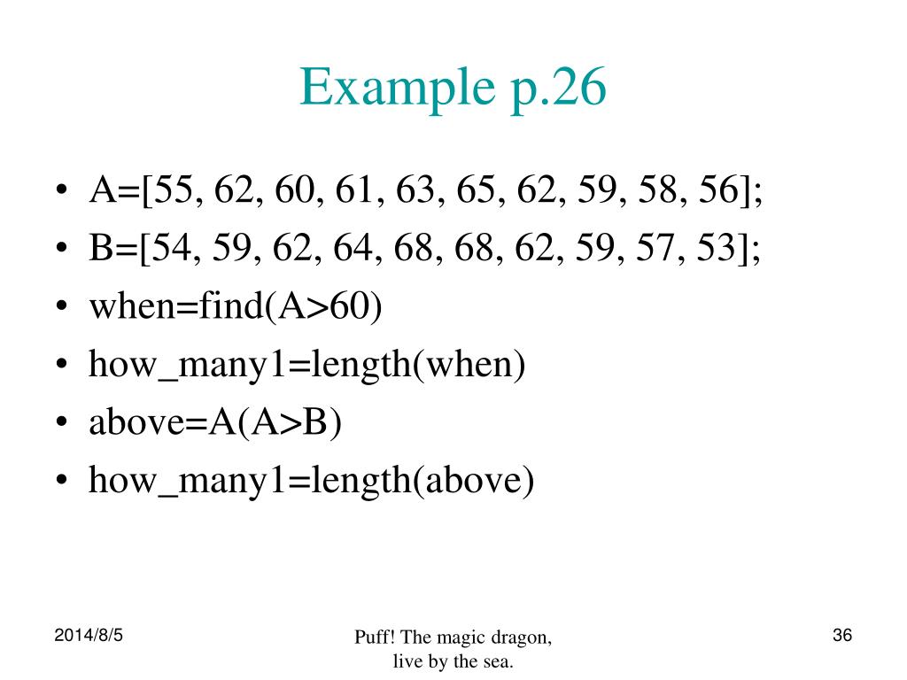 Example p.26 • A=[55, 62, 60, 61, 63, 65, 62, 59, 58, 56]; • B=[54, 59, 62, 64, 68, 68, 62, 59, 57, 53]; • when=find(A>60) • how_many1=length(when) • above=A(A>B) • how_many1=length(above) Puff! The magic dragon, live by the sea.