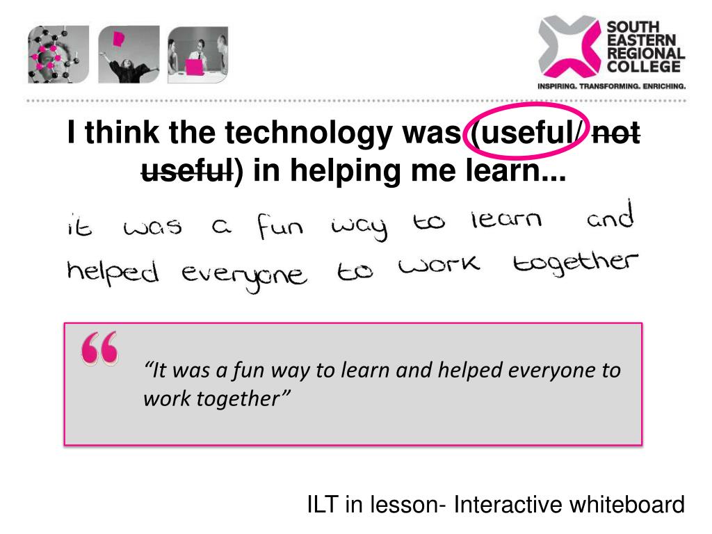 I think the technology was (useful/ not useful) in helping me learn... “It was a fun way to learn and helped everyone to work together” ILT in lesson- Interactive whiteboard
