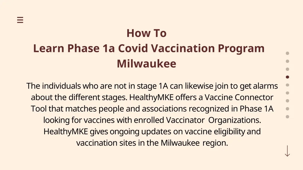HowTo Learn Phase 1a Covid VaccinationProgram Milwaukee The individuals who are not in stage 1A can likewise join to get alarms about the different stages. HealthyMKE offers a Vaccine Connector Tool that matches people and associations recognized in Phase 1A looking for vaccines with enrolled VaccinatorOrganizations. HealthyMKE gives ongoing updates on vaccine eligibility and vaccination sites in the Milwaukeeregion.