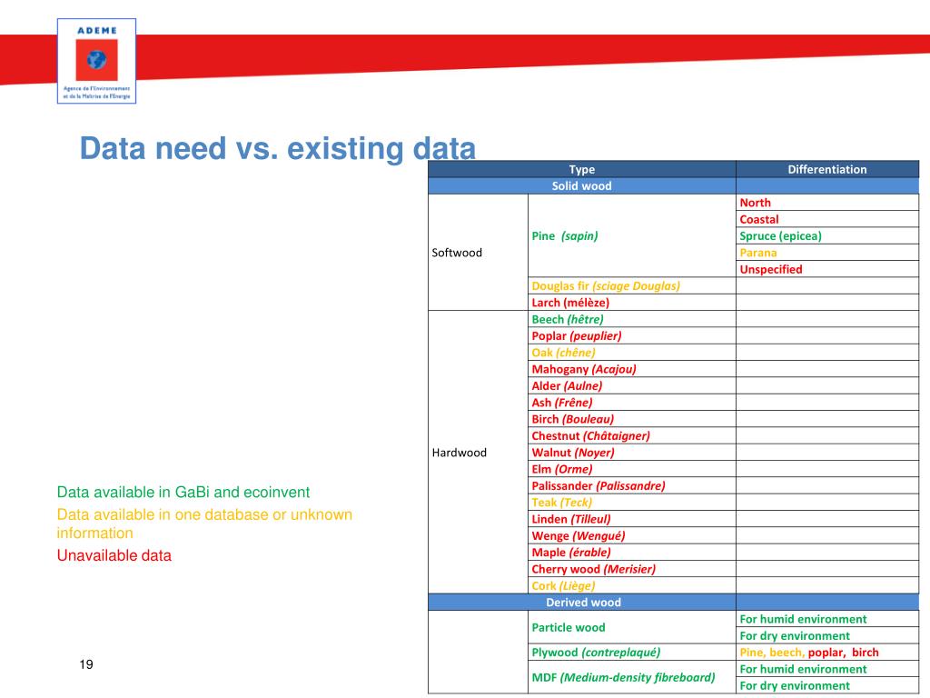 Data need – Geographical representativity • PCR does not require any geographical differentiation • What geographical level shall one consider: global ? Regional (temperate, tropical…)? National? • What are relevant parameters to differentiate a region from another? • The preliminary study does not give any statistics data for wood use regarding the production country • What are available statistical data regarding the origin of wood in products bought in France? • A study run by the methodological GT will complete these needs (in progress)