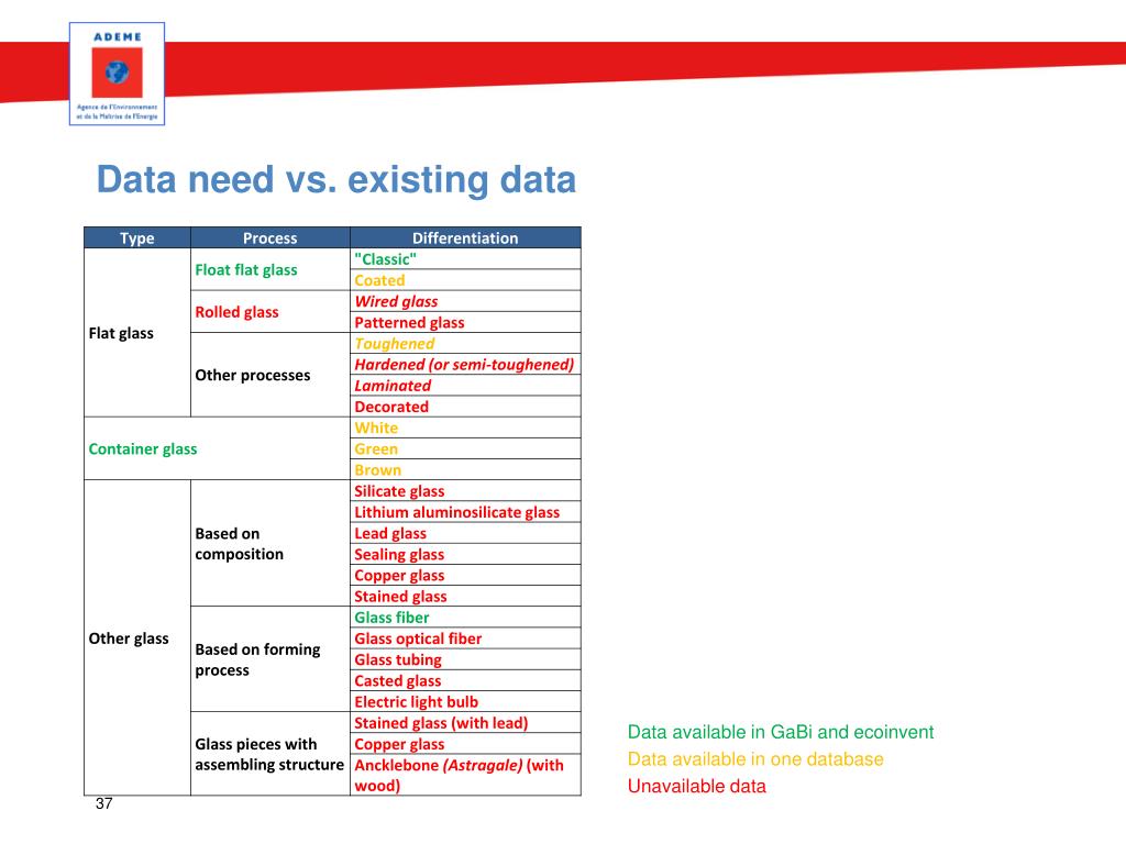 Data need – Technological representativeness • Must all those categories have an inventory? (e.g. sealing glass is included in electronic processes) • Must those categories be more differentiated? • Are there types of glass missing? • For product directly coming from glass production site (e.g. glassware), do we need inventories for glass raw materials (soda, sand…)? Since quantities and other parameters may be specific. • What is the ideal list of inventories to be integrated into the database?