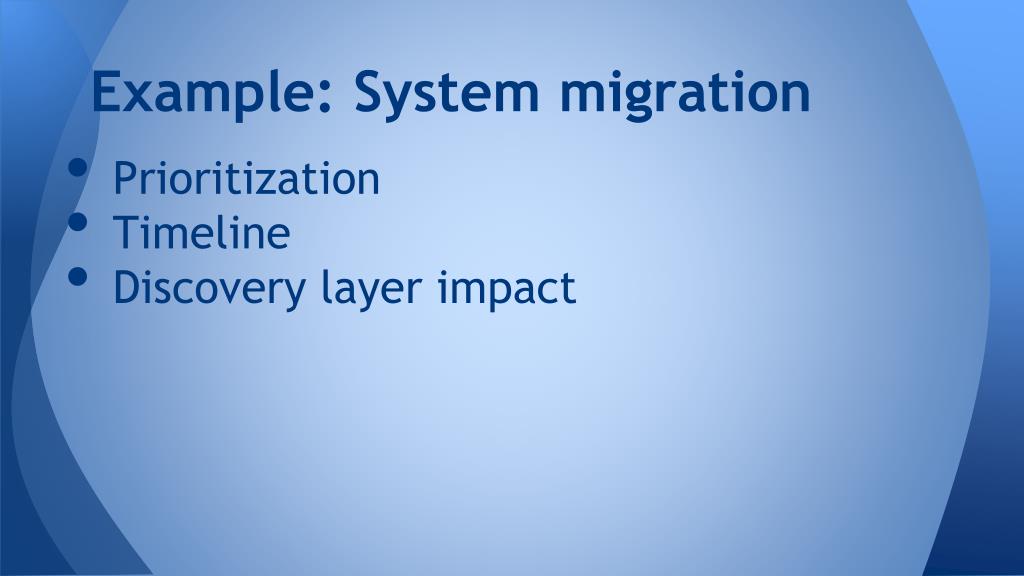 Example: System migration • Prioritization • Timeline • Discovery layer impact