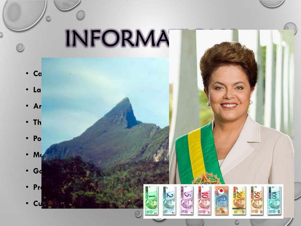 Informations • Capital city: Brasília • Largest city: São Paulo • Area: 8 511 965 km² • The highest point: Pico da Neblina (2994 m.) • Population: 201 032 714 • MainLanguage: Portuguese • Government: Federal presidential constitutional republic • President: Dilma Rousseff • Currency: Brazil Real (BRL)