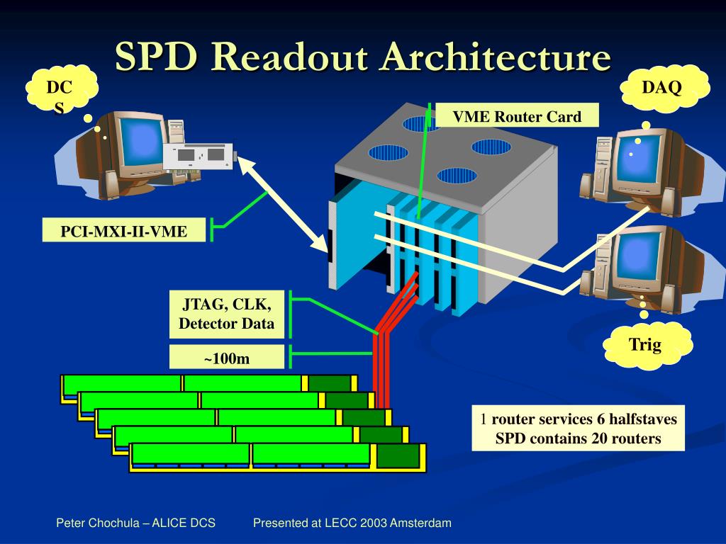 SPD Readout Architecture DCS DAQ VME Router Card PCI-MXI-II-VME JTAG, CLK, Detector Data Trig ~100m 1 router services 6 halfstaves SPD contains 20 routers Peter Chochula – ALICE DCS Presented at LECC 2003 Amsterdam