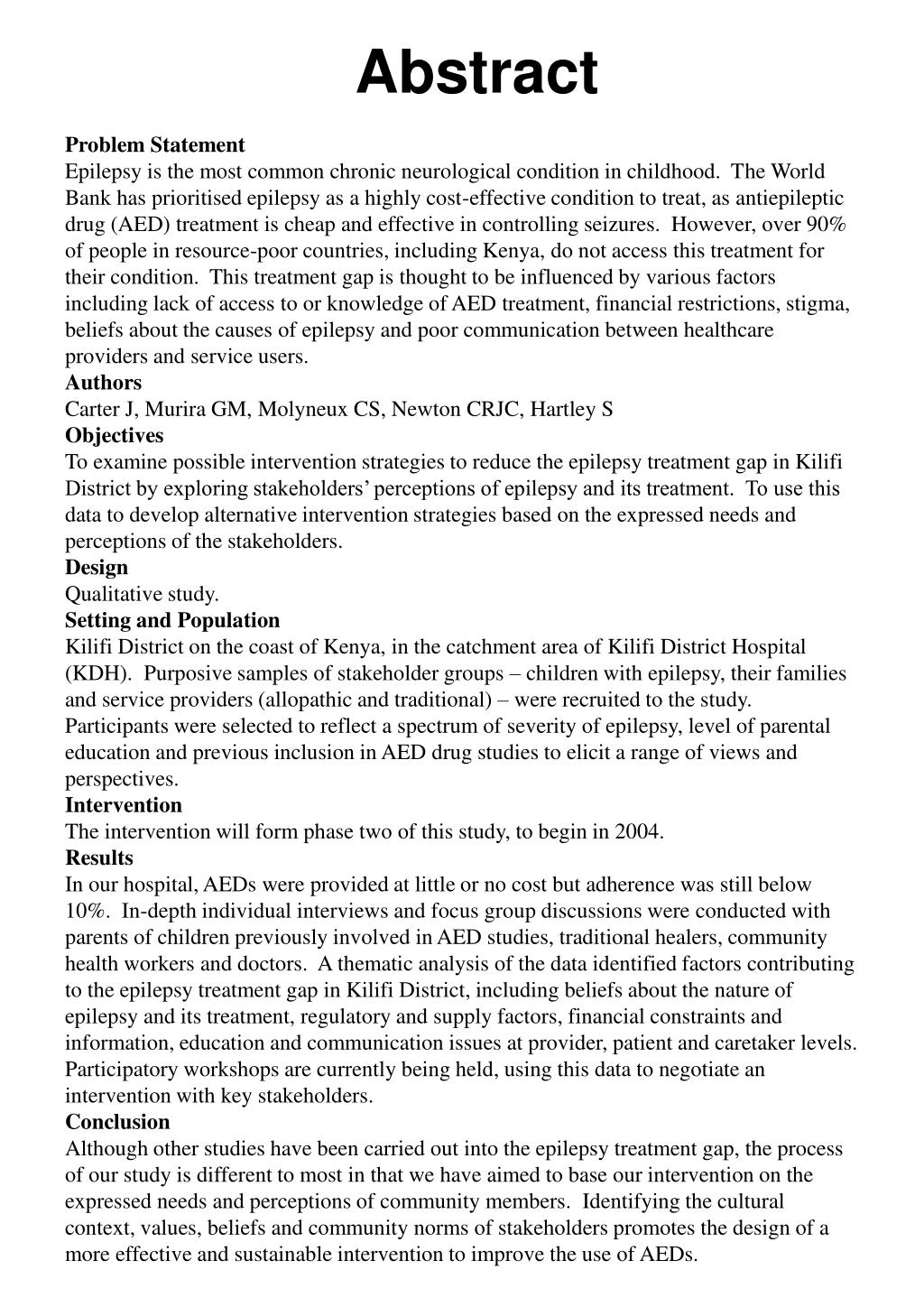 Abstract Problem Statement Epilepsy is the most common chronic neurological condition in childhood. The World Bank has prioritised epilepsy as a highly cost-effective condition to treat, as antiepileptic drug (AED) treatment is cheap and effective in controlling seizures. However, over 90% of people in resource-poor countries, including Kenya, do not access this treatment for their condition. This treatment gap is thought to be influenced by various factors including lack of access to or knowledge of AED treatment, financial restrictions, stigma, beliefs about the causes of epilepsy and poor communication between healthcare providers and service users. Authors Carter J, Murira GM, Molyneux CS, Newton CRJC, Hartley S Objectives To examine possible intervention strategies to reduce the epilepsy treatment gap in Kilifi District by exploring stakeholders’ perceptions of epilepsy and its treatment. To use this data to develop alternative intervention strategies based on the expressed needs and perceptions of the stakeholders. Design Qualitative study. Setting and Population Kilifi District on the coast of Kenya, in the catchment area of Kilifi District Hospital (KDH). Purposive samples of stakeholder groups – children with epilepsy, their families and service providers (allopathic and traditional) – were recruited to the study. Participants were selected to reflect a spectrum of severity of epilepsy, level of parental education and previous inclusion in AED drug studies to elicit a range of views and perspectives. Intervention The intervention will form phase two of this study, to begin in 2004. Results In our hospital, AEDs were provided at little or no cost but adherence was still below 10%. In-depth individual interviews and focus group discussions were conducted with parents of children previously involved in AED studies, traditional healers, community health workers and doctors. A thematic analysis of the data identified factors contributing to the epilepsy treatment gap in Kilifi District, including beliefs about the nature of epilepsy and its treatment, regulatory and supply factors, financial constraints and information, education and communication issues at provider, patient and caretaker levels. Participatory workshops are currently being held, using this data to negotiate an intervention with key stakeholders. Conclusion Although other studies have been carried out into the epilepsy treatment gap, the process of our study is different to most in that we have aimed to base our intervention on the expressed needs and perceptions of community members. Identifying the cultural context, values, beliefs and community norms of stakeholders promotes the design of a more effective and sustainable intervention to improve the use of AEDs.