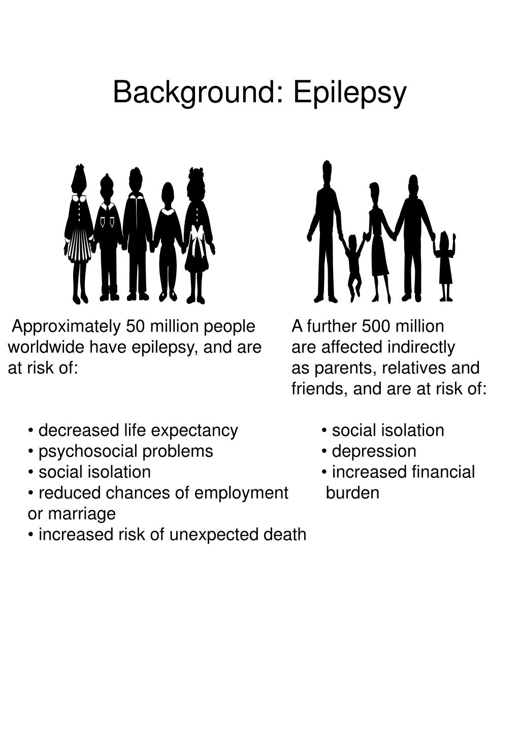 Background: Epilepsy • Approximately 50 million people • worldwide have epilepsy, and are • at risk of: • decreased life expectancy • psychosocial problems • social isolation • reduced chances of employment • or marriage • increased risk of unexpected death • A further 500 million • are affected indirectly • as parents, relatives and • friends, and are at risk of: • social isolation • depression • increased financial • burden