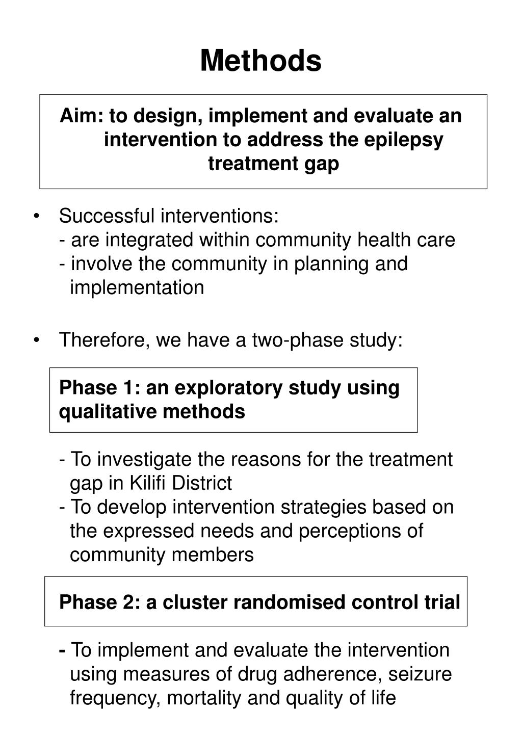 Methods Aim: to design, implement and evaluate an intervention to address the epilepsy treatment gap • Successful interventions:- are integrated within community health care- involve the community in planning and implementation • Therefore, we have a two-phase study:Phase 1: an exploratory study using qualitative methods- To investigate the reasons for the treatment gap in Kilifi District- To develop intervention strategies based on the expressed needs and perceptions of community membersPhase 2: a cluster randomised control trial- To implement and evaluate the intervention using measures of drug adherence, seizure frequency, mortality and quality of life