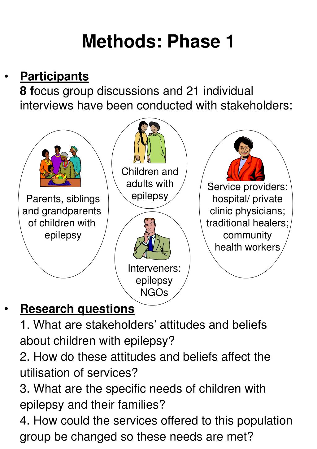 Methods: Phase 1 • Participants8 focus group discussions and 21 individual interviews have been conducted with stakeholders: • Research questions1. What are stakeholders’ attitudes and beliefs about children with epilepsy?2. How do these attitudes and beliefs affect the utilisation of services?3. What are the specific needs of children with epilepsy and their families?4. How could the services offered to this population group be changed so these needs are met? Children and adults with epilepsy Service providers: hospital/ private clinic physicians; traditional healers; community health workers Parents, siblings and grandparents of children with epilepsy Interveners: epilepsy NGOs