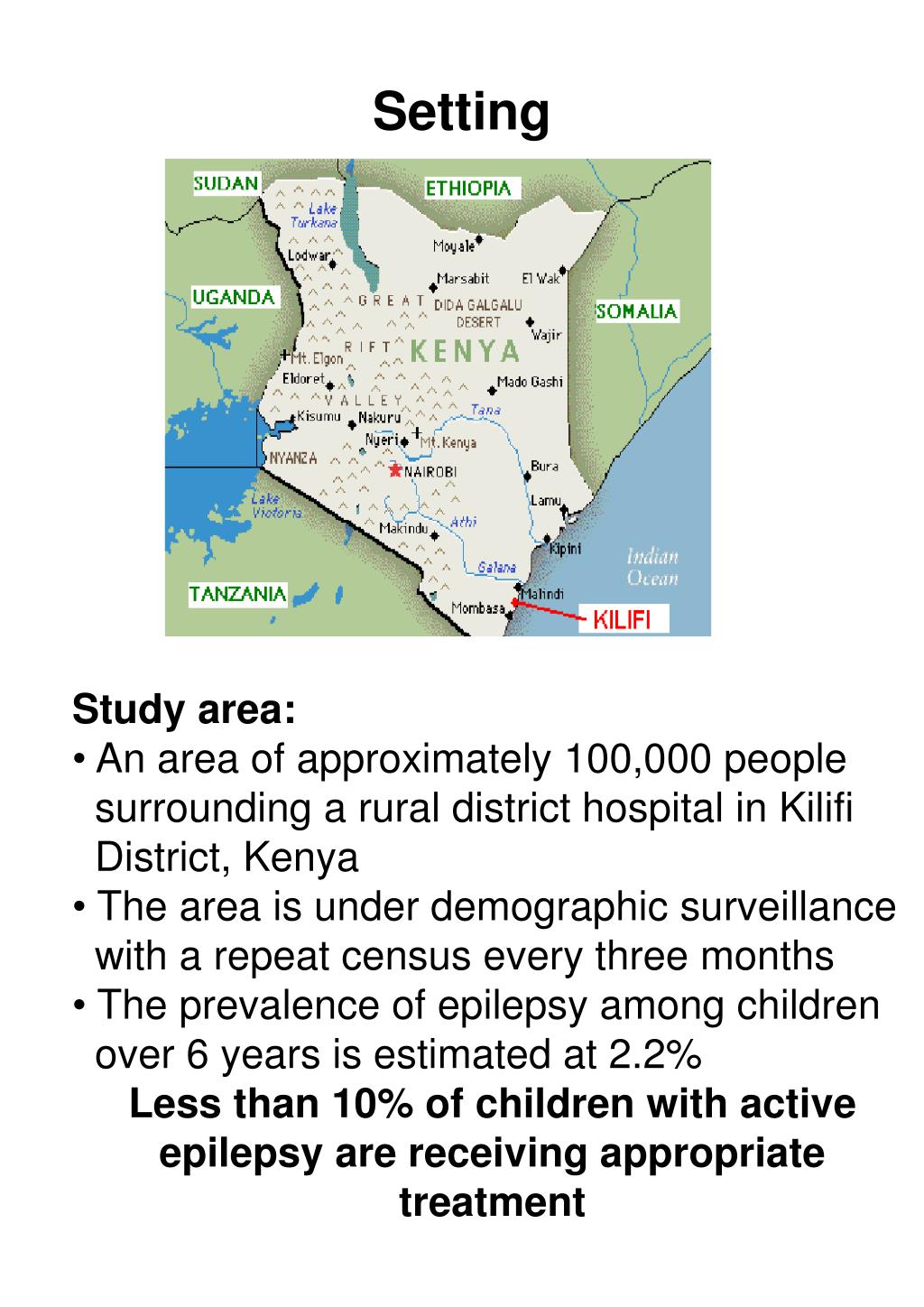 Setting • Study area: • An area of approximately 100,000 people • surrounding a rural district hospital in Kilifi District, Kenya • The area is under demographic surveillance with a repeat census every three months • The prevalence of epilepsy among children over 6 years is estimated at 2.2% • Less than 10% of children with active epilepsy are receiving appropriate treatment